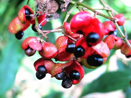 野鸦椿花开于春夏之际,花朵呈黄白色,远远望去仿佛满树银花的清雅。入秋之后,枝头上果实累累,鲜红的内果皮上沾了黑色的种子犹如满幕的黑色珍珠,分外的妖娆。