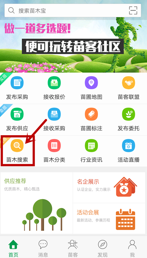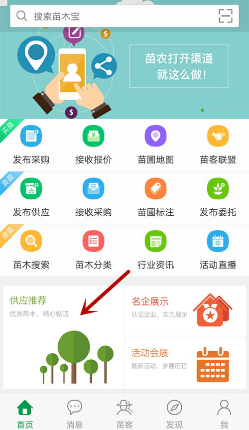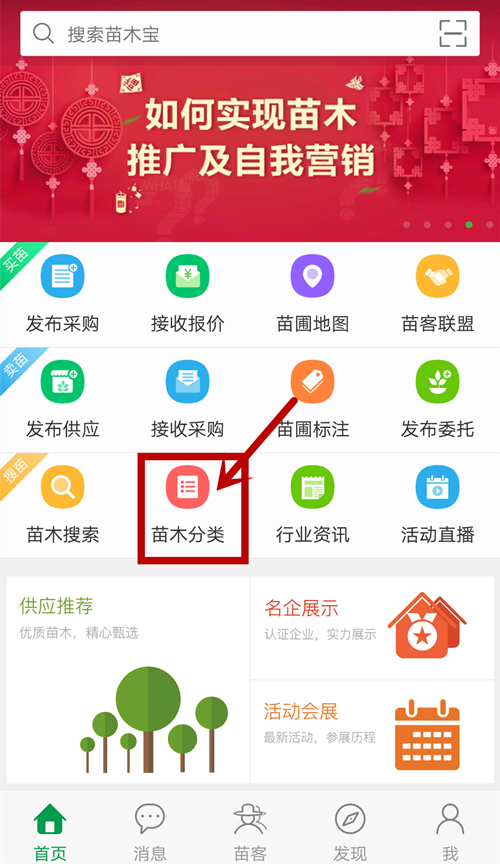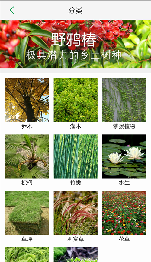 2.进入“苗木分类”,您可以在专题海报中直接找到野鸦椿的供应商。