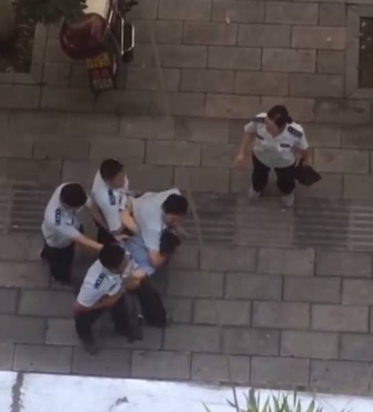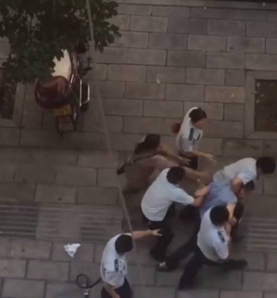 楚天都市报记者从一段1分多钟的视频看到,4名身穿城管制服的男子在街上拖着一名男子前行,过程中一人用手臂锁住男子脖颈,其他人则拽住男子手脚。男子在反抗中被按倒在地,一人上前猛抽其耳光。画面中有一名中年女子出现,一直跟在后面哭着希望把男子拉出,但被不断推开。最后被打者躺在地上,中年女子在一旁哭泣,几名城管队员则站在一旁,有围观群众质问城管为什么打人。