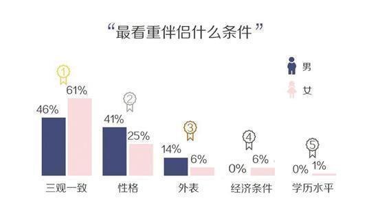 在如今这个看脸的时代,看着偶像剧长大的95后,会将外表做为选择另一半的重要标准,没想到竟然有这么多人选择“三观一致”。经济条件的比重在女生中也只占6%