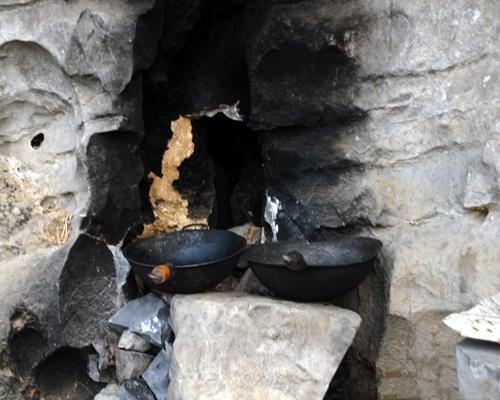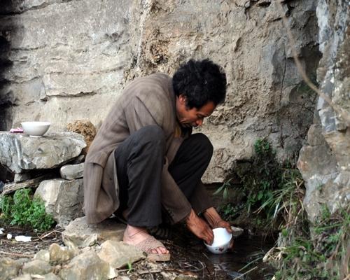 图为男子在洗碗,他每天都得将自己的锅碗洗的干干净净,不然洞里的老鼠就会去舔他的锅碗。