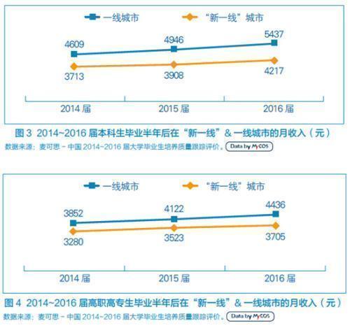 对于毕业生的收入,上述报告也进行了对比。2014至2016届毕业生毕业半年后在“新一线”与一线城市工作的月收入均呈稳步增长趋势,但在“新一线”城市就业的大学生月收入始终低于一线城市。