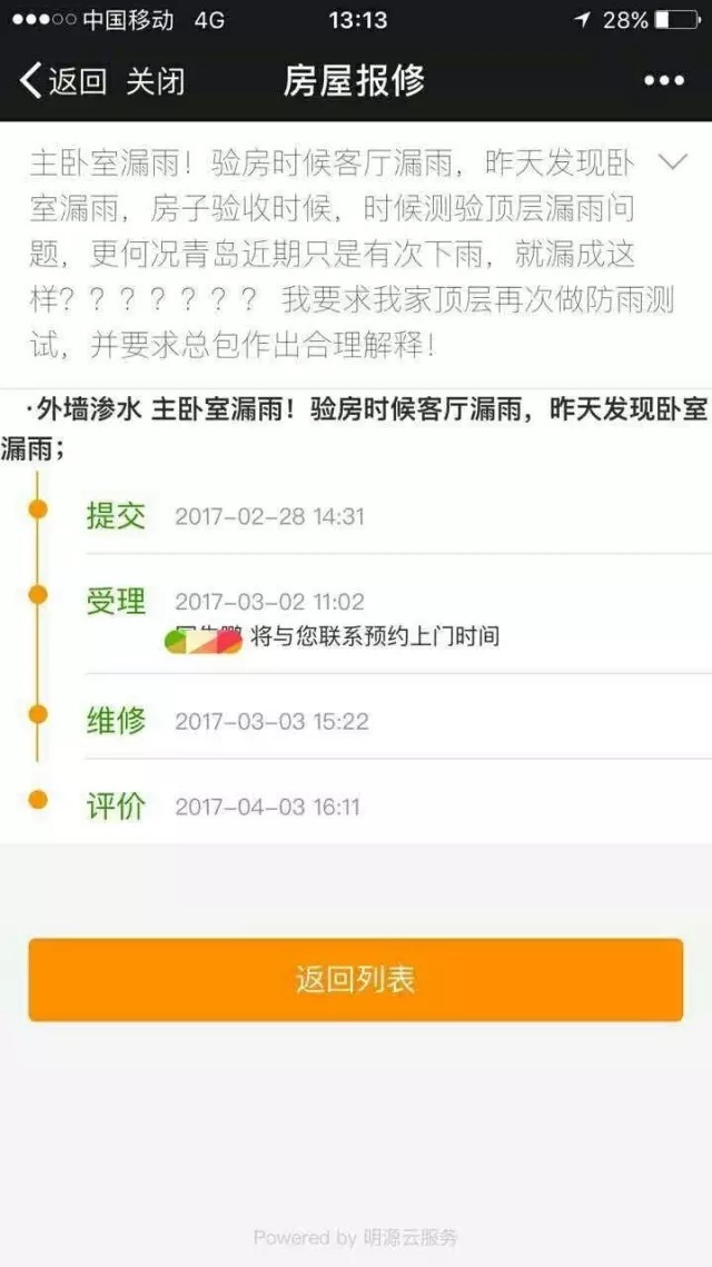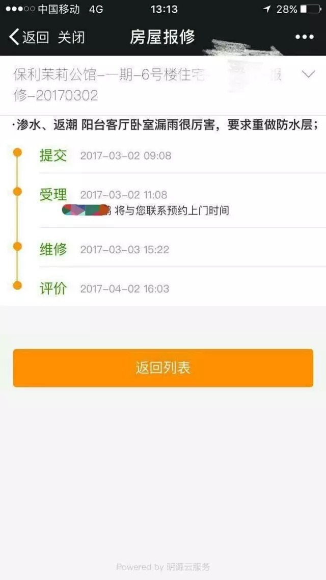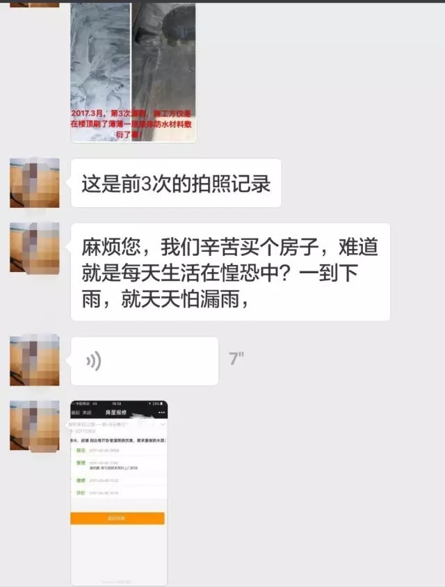 前三次漏雨,唐女士都在保利官方微信平台上申请了报修。