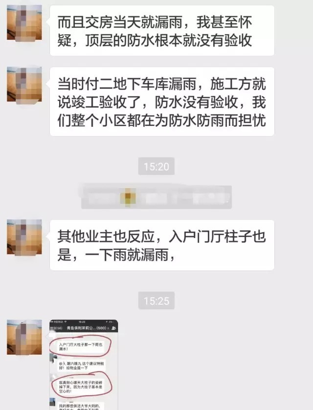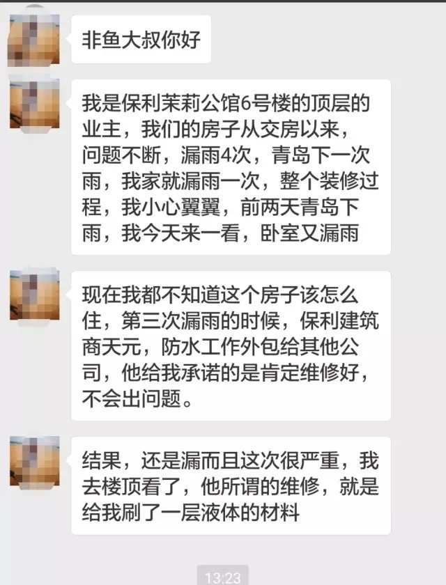7月29日上午,青岛保利茉莉公馆一位女业主唐女士(化名)微信求助非鱼大叔:她在保利茉莉公馆买了一套两居室的房子,今年交完房,发现一个巨大的问题,漏雨,而且交房后的前三个月,每月都要漏一次雨。今天(7月29日)去房子时,又漏雨。唐女士已无语。