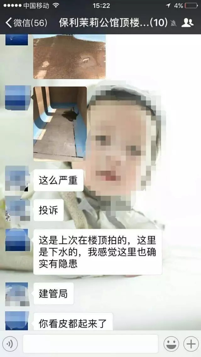为了房子漏雨的事儿,唐女士和邻居们还专门了成立了一个顶层住户群,专门讨论保利茉莉公馆的“顶层设计”问题。