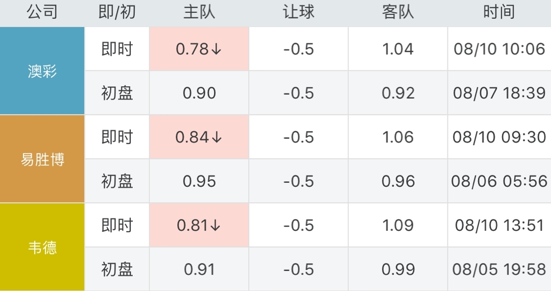 从DS足球给出的数据来看,本场比赛亚盘多以主让半球中水起步,受注后上盘水位下调,部分庄家升至半一高水。
