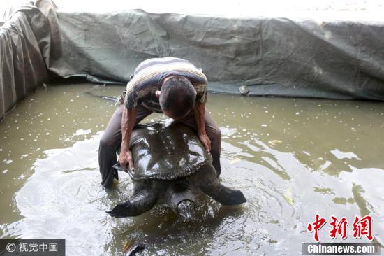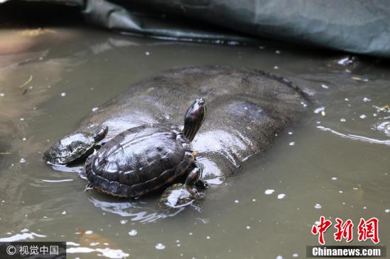据现场一位市民说:"听说是在2003年,一位香客放生在这里。但目前也没办法确定这一说法的真实性。"图为一只巴掌大的小乌龟"淘气"地爬到了巨鼋背上,巨大的身形差距,让人一目了然。