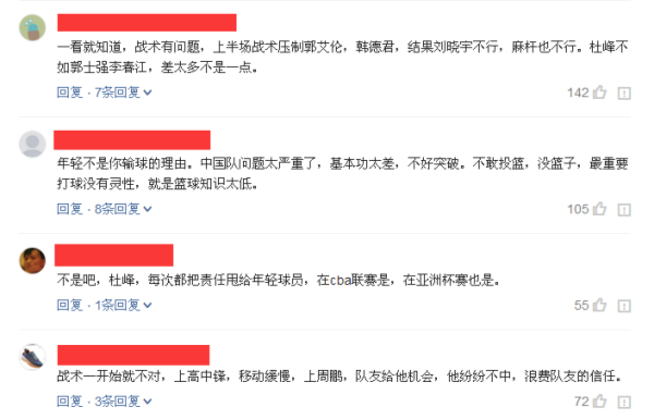 对于这场比赛的失利许多网友也给出了他们自己的看法:就是战术问题,上半场战术压制郭艾伦,韩德君,结果刘晓宇不行,麻杆也不行。杜峰的执教能力与李双江比起来实在差的太多不是一点。到底男篮输球是谁的原因呢?杜锋这回到底该不该背锅呢?大家是怎么看的!