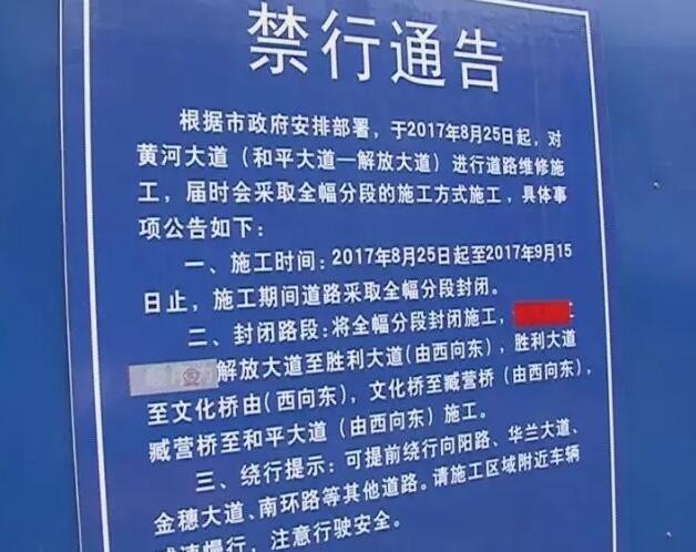 据了解,这次施工将采取全幅分段封闭施工,对黄河大道(解放大道至胜利街)、(胜利街至文化桥)、(文化桥至臧营桥)、(臧营桥至和平大道)依次施工。施工期间,禁止机动车辆通行,非机动车辆暂时能够通行。需要提醒的是:广大司机可以选择从向阳路、华兰大道、金穗大道、南环路绕行。这次施工预计挖补作业为3天,罩面施工为7天,整个黄河大道(和平大道至解放大道)道路改造工程预计在9月10日前完工。