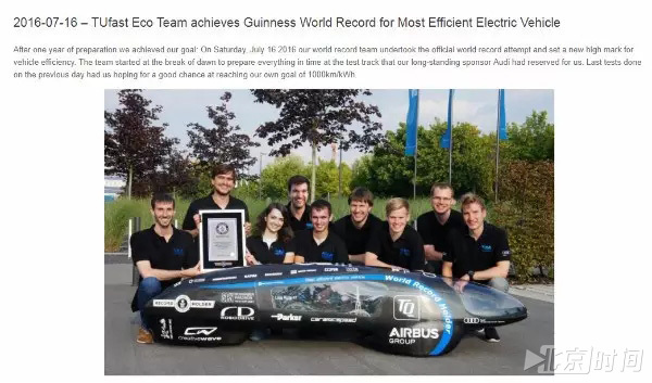 那这车这也太牛了吧!因此,头条君对1度电跑1000多公里这事表示怀疑,于是决定去探个究竟。毕竟某空调君也才喊出“一晚低至一度电”的口号,某手机君也才“充电五分钟,通话两小时”呀。令人意外的是,这事倒不假,只是发生在去年7月,当时就有媒体报道过了。这冷饭炒得也是……成功地引起了我们的好奇。在2016年7月16日的壳牌汽车环保马拉松(ShellEco-marathon)上,德国慕尼黑工业大学的TUfast Eco Team团队研制的eLi14电动车,取得了1度电跑1232公里的成绩 ,打破了吉尼斯世界纪录。