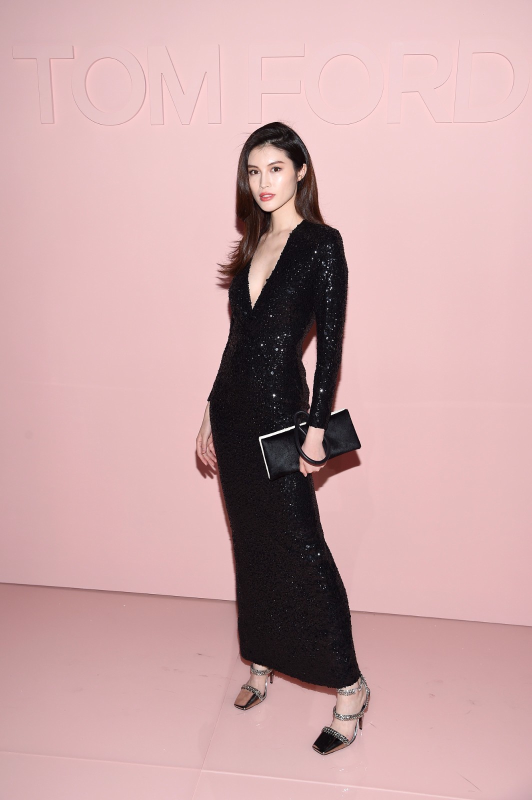 白炽灯一样的何穗一出场变夺得万人目光,超模何穗身穿黑色亮片深V领长袖修身长裙,手拿黑白拼色马海毛手拿包,脚穿银色镜面高跟鞋,艳压全场,性感而霸气。