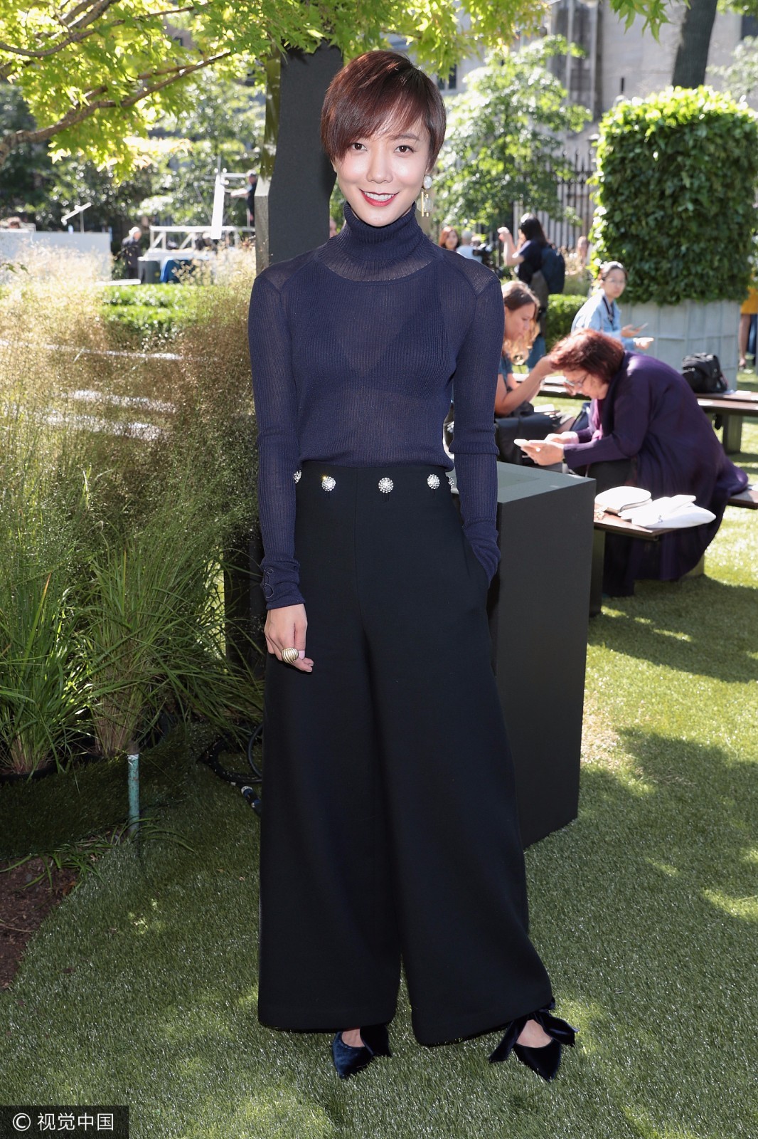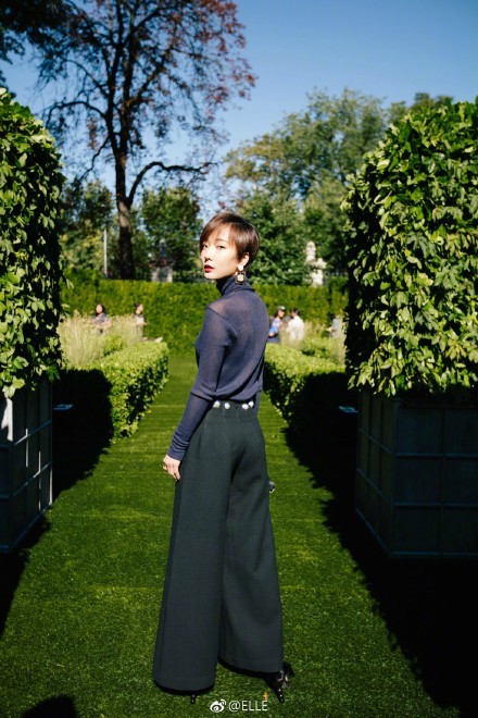 wuli丹丹身穿秋冬蓝色针织衫和黑色阔腿裤,搭配精致的刺绣手包及天鹅绒缎面蝴蝶结高跟鞋,可优雅干练、可娴静舒适、可利落帅气,加上一头清爽的短发,尽显优雅干练。