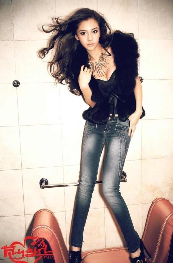 Angelababy 2011年代言服饰品牌尝试多种造型,其中一套她穿着黑色绑带马甲,下半身则是合身牛仔裤,配上浪漫大卷发、烟熏妆,非常有神秘吸引力,尤其超紧身上衣让她的浑圆胸形呼之欲出,秀出性感魅惑的一面,令人印象深刻。
