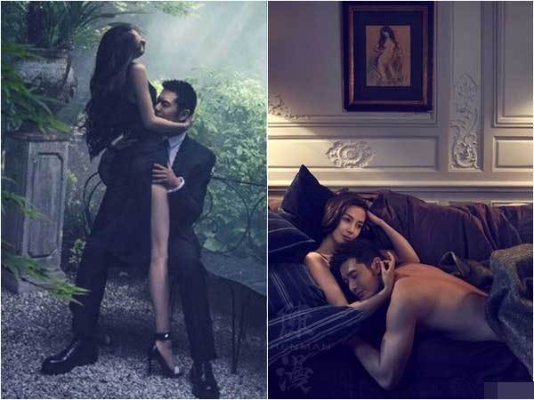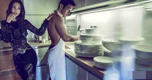事实上,Angelababy在婚前也曾和老公黄晓明一起耍性感,婚后1年才公开的“私密婚纱照”中,不只有老公裸上身钻进她怀里的画面,还有她穿着超贴身黑色蕾丝洋装,抚摸全身上下只穿着内裤、围裙的老公,画面极为挑逗,也十分有趣。