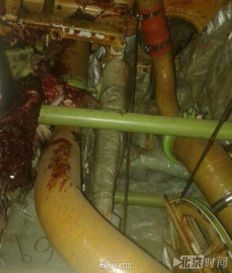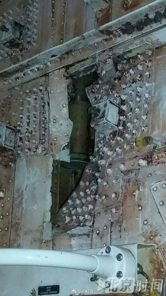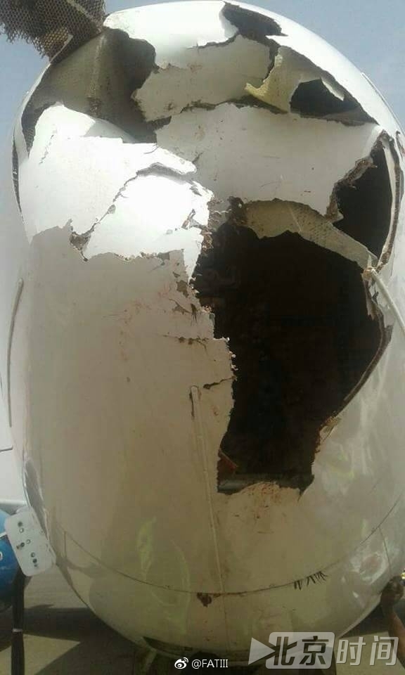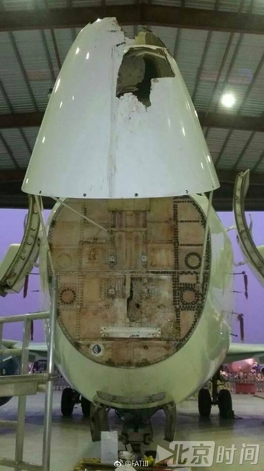 从现场图片看,飞机受损严重,机鼻整流罩被大面积击穿,形成一个大洞,内部也有明显损伤。