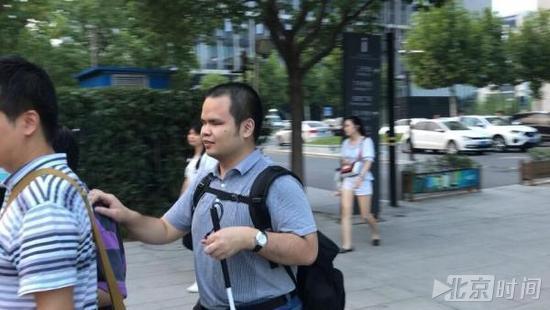 傍晚下班后,全盲的严夏明和同事一起回家。
