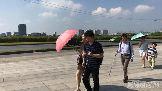 早晨曹晴晴和同事从公交车下来,一起走向写字楼。一般由全视力或低视力与全盲者搭伴行走。