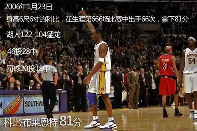 2、科比,81分:2006年1月23日,湖人对阵猛龙,科比全场46投28中,其中三分球13投7中,罚球20次得18分,四节分别得到14分、12分、27分和28分。