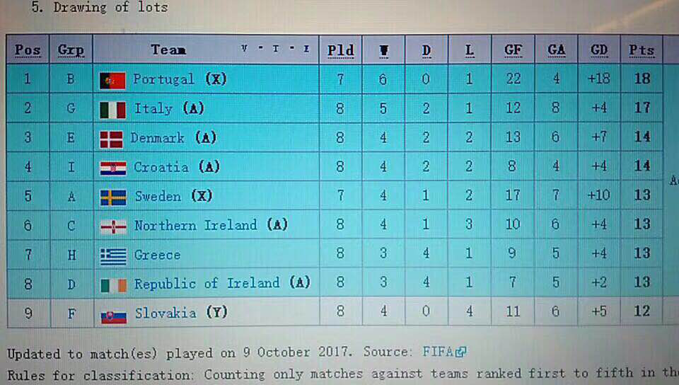 昨晚局势纷乱的D组和I组经过一夜死战,遗憾的告诉大家,18年俄罗斯世界杯将没有贝尔,也将没有哈姆西克了。关于斯洛伐克为何成为最差的小组第二,在这里给大家解释一下:成绩最好的八个小组第二的判断不计算与小组垫底球队的对战成绩(据说是因为科索沃和直布罗陀这两支刚加入国际足联球队的关系)。当然今晚的两个小组第二:葡萄牙和瑞典已经不需要再考虑这个情况了,两队的积分很充足,虽然对今晚的比赛结果没有影响,作为科普和大家简单说明一下。而在昨晚的比赛结束后,各个小组第二出去和小组垫底球队的对战成绩后的积分、净胜球情况如图:斯洛伐克由于积分不足,惨遭淘汰。