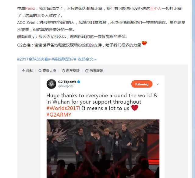 在最后的一场比赛里,FB对战G2里也可以看出来G2有放水的“意思”,不仅在大赛里拿出来非常罕见的“亚索”,而且在对战的期间,节奏上也是非常的“放松”!并没有之前的“紧张感觉”!毕竟这一个战队回去之后这个队伍就要解散了,心疼欧洲法王一波!而且在G2的官推里我们看到了中单Perkz也对今天的泪水表示:“我难过的不止是因为输掉比赛,而是我们有可能再也没办法五个人一起打比赛了!”