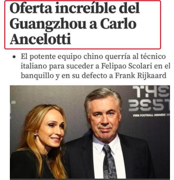 据西班牙媒体《世界体育报》报道,中超7连冠霸主广州恒大向意大利名帅安切洛蒂,开出了高达2000万欧元的税后年薪邀请其加盟,合同期3年,折合人民币接近5亿,结果仍然遭到了安切洛蒂的拒绝。