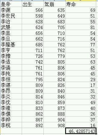 2 唐朝国祚289年一共有21个皇帝,平均寿命高达46岁,比汉朝高出整整18岁,唐朝i的皇帝大都长命,有4个活过60岁。
