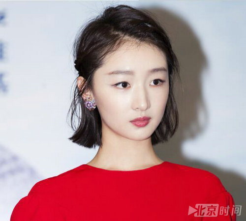 周冬雨为一件单肩小礼服搭配了银子的圆圈耳环,这样的搭配和她的小短发很是相称。