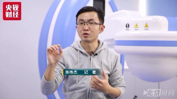 张伟杰 记者:我手里拿到的就是这个胶囊内镜机器人,那大家可以看到,它的前部 闪光的这个部分,其实是一个高清摄像头,可以实时地把画面传送到,我旁边的这台仪器上面 ,那现在呢?我就吞下这颗胶囊机器人来开始进行检查 。