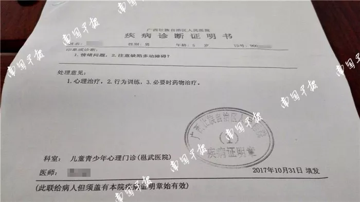 陈女士说,事发后,康康被送往合浦县人民医院就诊,诊断结果为左下颚有软组织挫伤。10月下旬,康康又被送往自治区人民医院检查,结果显示其儿童感觉统合能力重度失调,需进行心理治疗和必要时的药物治疗。