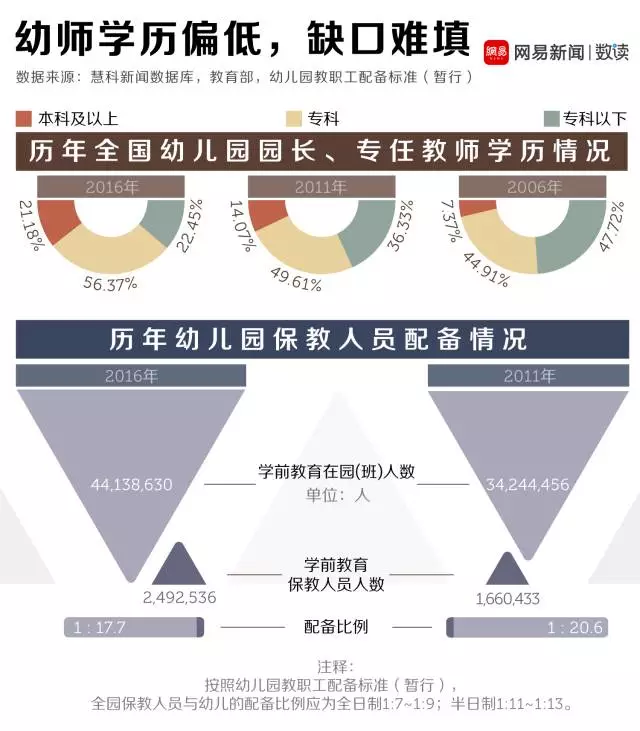 另外,幼师学历偏低已成为普遍现象。据“网易数读”数据,2016年全国幼儿园园长、专业教师学历分布为:本科仅占21.18%,专科占56.37%,专科以下占22.45%;而幼儿园保教人数配备与在园人数之比仅为1:17.7。