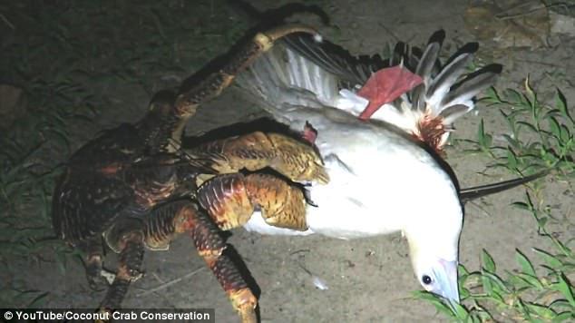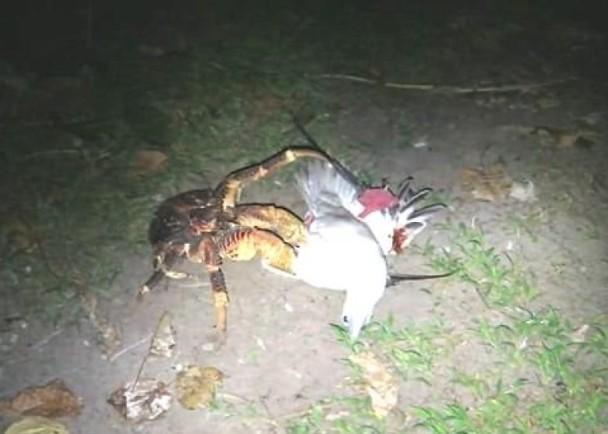 科学家发现力大无穷的椰子蟹在黑夜能袭击在树上鸟巢熟睡的海鸥,椰子蟹通过强劲的巨钳,折断海鸥的一只翅膀,并将对方拉落沙地。