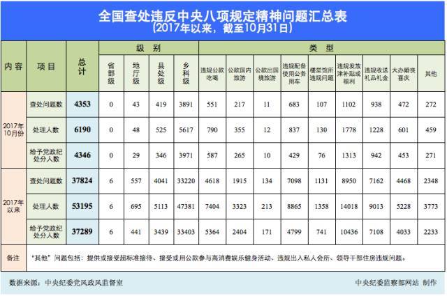 在“打虎”的前一天,中央纪委监察部网站发布2017年10月全国查处违反中央八项规定精神问题月报数据。这是中央纪委连续第49个月发布违反中央八项规定精神问题月报数据,也是十九大之后的首次月报。