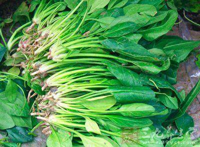 鲜菠菜养血,润燥,麻油滋阴。本菜特点是滋阴,清热,润肠。适用于头痛,便秘,面红,目眩,耳鸣,尿黄,心烦口渴等患者食用。