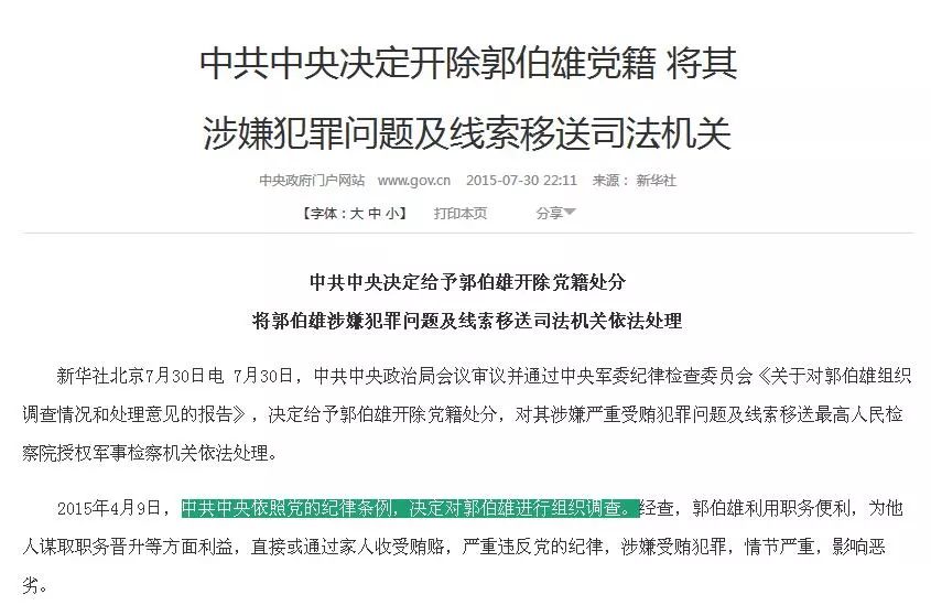 徐才厚被组织调查一年后,2015年4月9日,中共中央决定对郭伯雄进行组织调查,3个多月后(2015年7月30日),同样是在中央政治局会议上,郭伯雄出事的消息被官方首次披露。