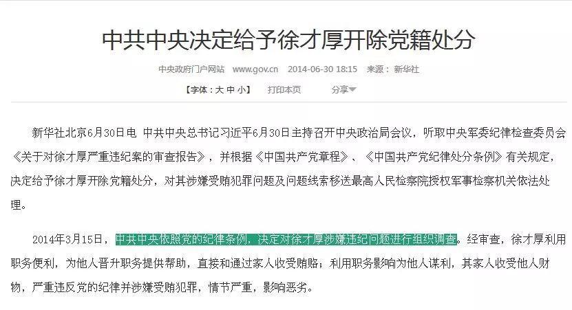 政知道(微信ID:upolitics)注意到,2014年3月15日,中共中央决定对徐才厚进行组织调查,而他落马的消息,则是在三个半月后(2014年6月30日)的中央政治局会议上被披露。