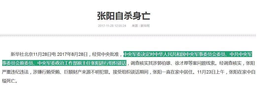 11月28日,在自杀4天后,“张阳自杀”的消息被新华社首发。这个时间,距离中央军委决定对张阳进行组织谈话整整3个月(2017年8月28日)。