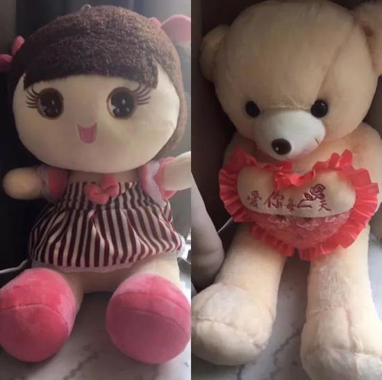为了让孩子有安全感,还专门给唐乐准备了礼物,一个咧嘴笑的娃娃,和一只写着“爱你每一天”的小熊公仔。这两个娃娃都有半人高,孩子抱着正好。
