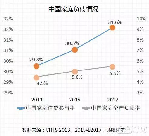 《报告》显示,中国城镇家庭资产负债率从2013年的4.5%增至2015年的5%,2017年再增至5.5%。