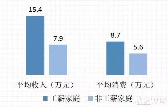 调查数据显示,工薪家庭的年平均收入为15.4万元,非工薪家庭只有7.9万元;工薪家庭年平均消费8.7万元,高于非工薪家庭的5.6万元;两者在包括房产在内的家庭总资产差距更大,工薪家庭的总资产为177.6万元,非工薪家庭为91.6万元。