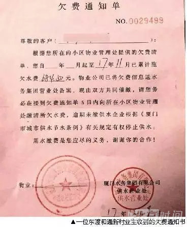 耐人寻味的是,催缴通知书上标注的“您自__年__月起至2017年11月已累计拖欠水费……”而自哪一年哪一月并没有明确标注,留了空白。“敢不敢写是从什么时候开始计算的水费?他们是害怕业主发现存在重复收费吗?”业主林先生质疑。