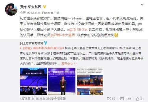 随后华大基因CEO尹烨在微博否认此事,他说:“礼节性点头都被炒作。虽然同在一个Panel,也喝王老吉,但不代表认可此结论。”
