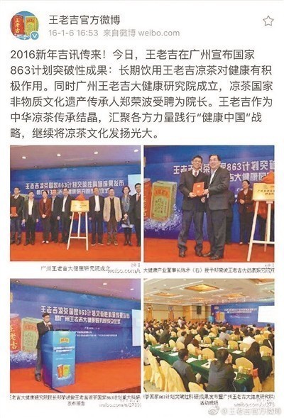 到了2016年1月6日,王老吉再次发布了“突破性”科研成果:按照国家标准及美国FDA标准,国内首个凉茶产品3年安全性系统研究表明,长期饮用王老吉凉茶可延长动物寿命。