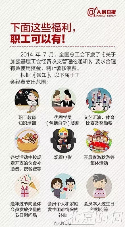全国总工会就员工福利发放的相关规定做出明确解释:会费组织看电影、春秋游等活动,均属于合理范畴。
