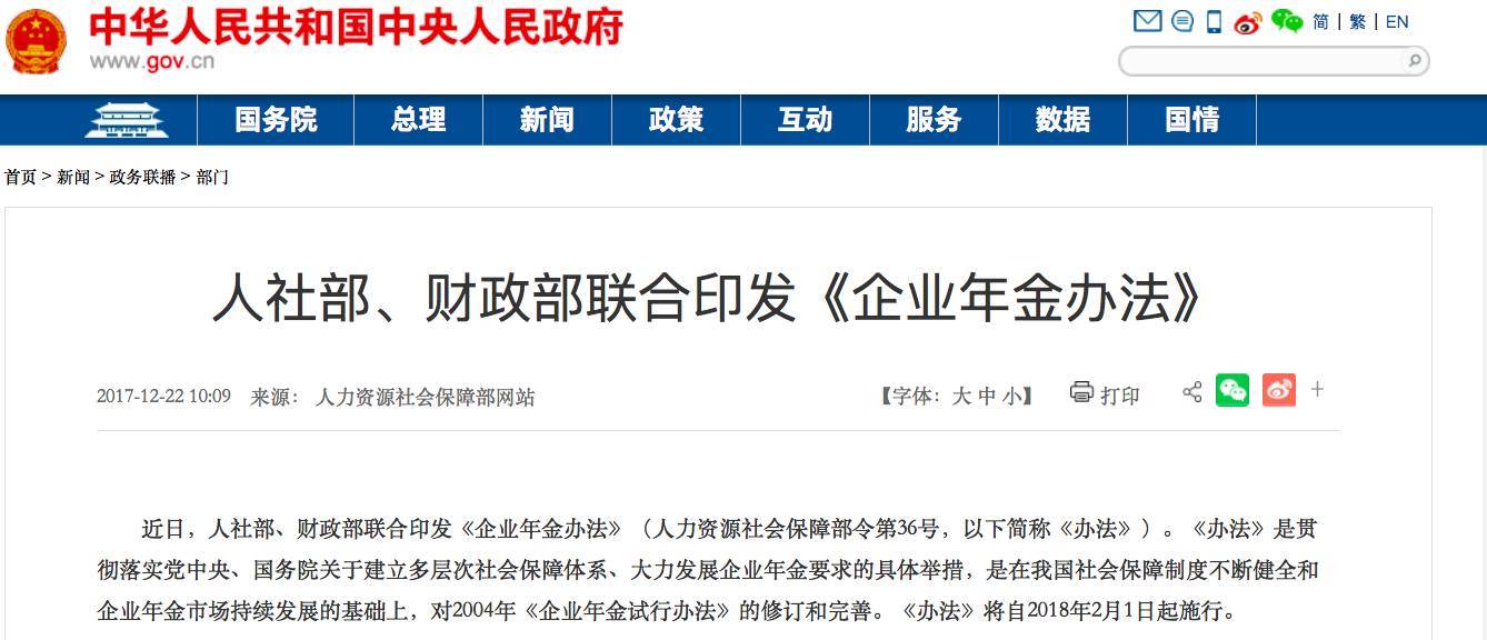 近日,人社部、财政部联合印发《企业年金办法》。《办法》将自2018年2月1日起施行。