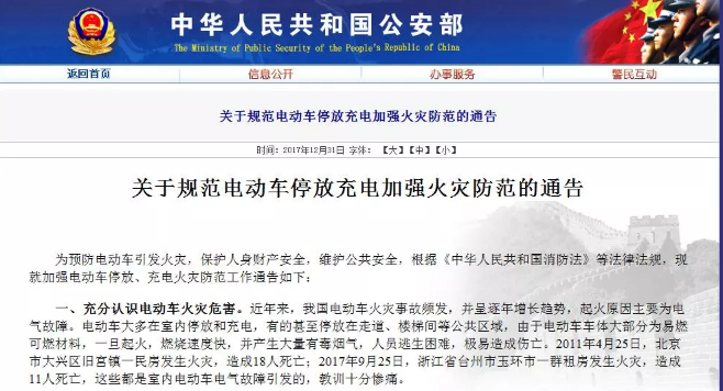 2017年12月31日,公安部紧急下发《关于规范电动车停放充电加强火灾防范的通告》。