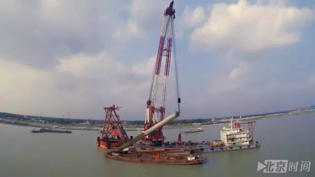 历经48小时,总长120米、直径3米、总重550吨的全球最大的桥梁主墩钢桩,稳稳地嵌入河床120米深处。