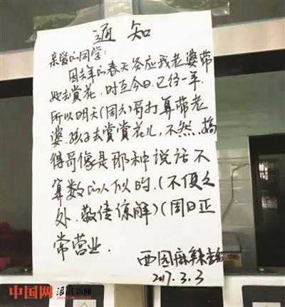 从前年中秋开始,武汉生物工程学院厨师侯高红,先后贴出了4张停业通知单——“中秋相亲停业一天”“相亲失败再相亲停业两天”“老婆临产停业三天”“全家赏花停业一天”。看到这些另类通知的同学们不淡定了:这完全就是一条“人生赢家之路”嘛。据记者了解,这些“通知”也许还将继续。