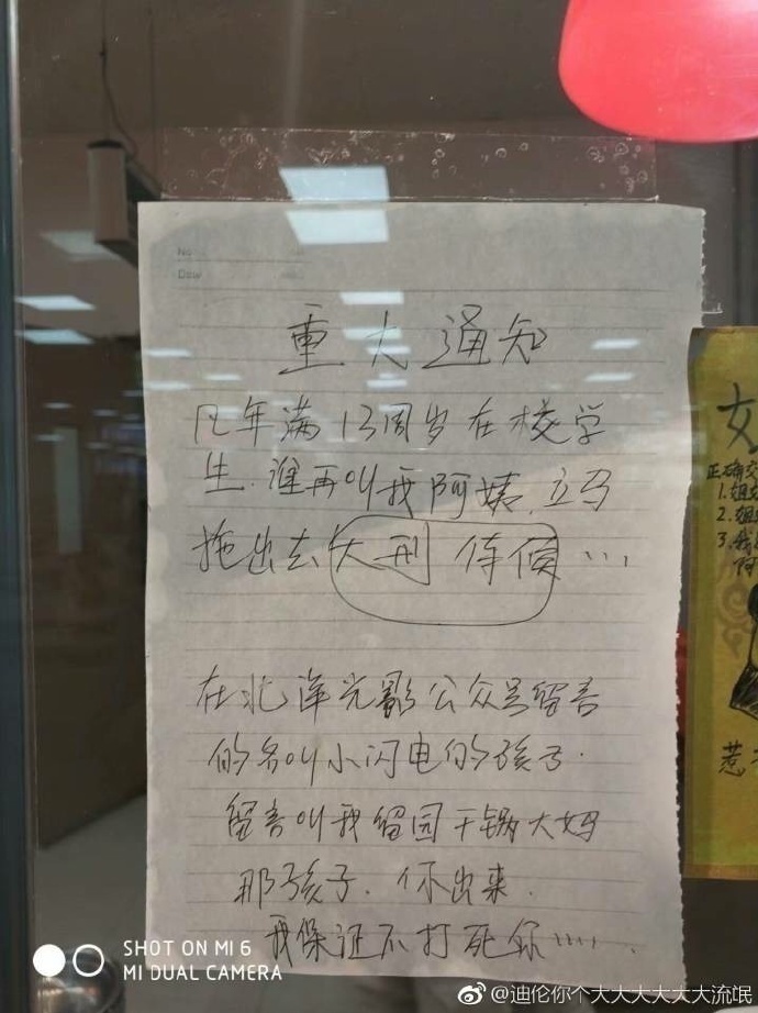 近日,天津大学留园餐厅窗口一名东北小姐姐火了!因为在窗口门前,贴着几张霸气的告示,上面写明:凡年满13周岁在校学生,谁再叫我阿姨,立马拖出去大刑侍候。同时在通知下写到,那个叫她留园大妈的孩子,你出来我保证不打死你。此公告一出便引来了学生的不少回复,并在网络上传开。