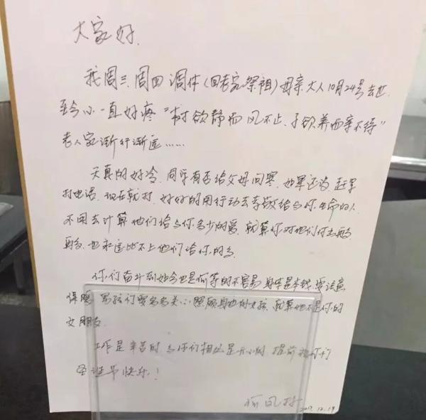 “天真的好冷,同学们有否给父母问寒?如果还没,赶紧打电话,现在就打,好好地用行动去孝敬给予你生命的人,不用去计算他们给予你多少的爱,就算你对他们付出再多再多,也永远比不上他们给你的多。”前不久,浙工大朝晖精弘食堂何师傅写给师生的“请假条”在网络上火了,感动了无数人。
