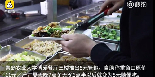 最近传出了山东某高校食堂推出限时自助餐的消息。食堂还能自助,也是头回听说,不愧为别人家的,会玩儿。转念想想,怎么老是别人家的?长叹兮以掩涕兮,哀自己家的不争。恨不能重修!"五元管饱随便吃",这家食堂推出的限时自助餐,夏天晚上7点后,冬天晚上6点半后,原本卖11元/斤的晚饭,现在5元钱就能随便吃。众所周知,大学食堂每天做的饭菜都是宁多勿少,所以每天其实都会有大量的浪费。如何减少浪费呢?最好的办法当然是给像沸腾君这样的吃货们一个展示才华的机会。(来源:新京报)